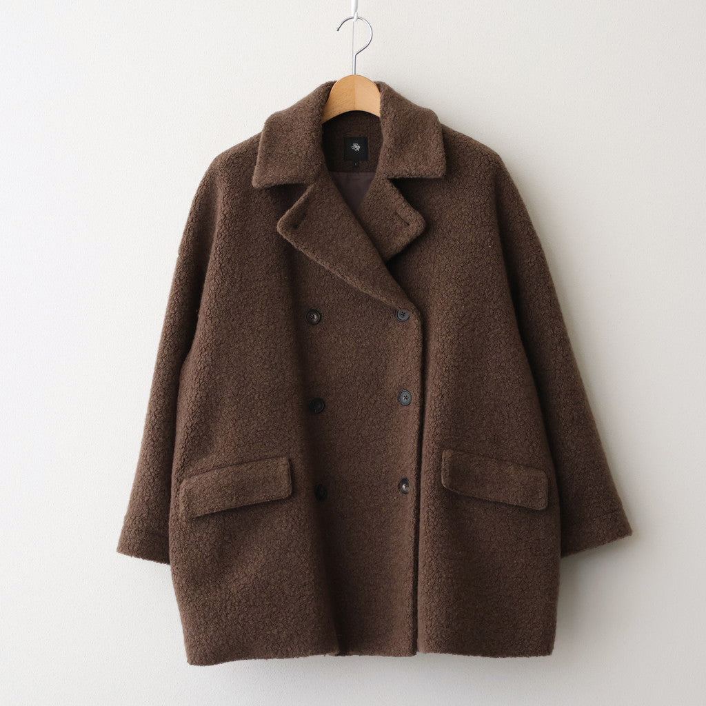 リサイクルウールを使用したブークレを少し圧縮したような素材感のダブルブレストコートです。