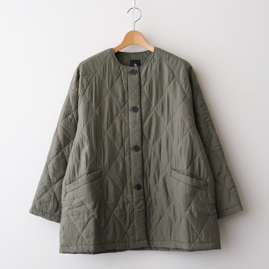 シルク(表地)とコットン(裏地)の生地の間にポリエステル綿を挟んでキルティングに仕上げた、軽くて防寒にも優れたショートコートです。